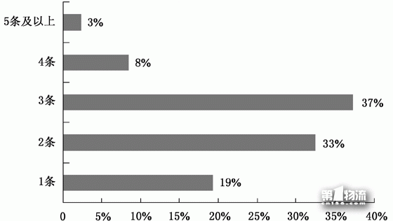 根据《规范》,统计物流园区周边5公里以内的高速公路、国道、省道总条数情况,从图10可知,70%的物流园区5公里以内有2~3条公路,临近四条及以上公路的物流园区占比为11%。物流园区公路便利性总体良好。