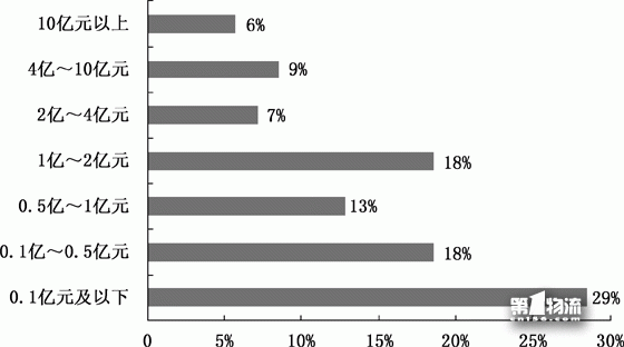 物流园区平均规划投资额为201亿元。其中,投资1亿~10亿元的物流园区占51%;10亿~30亿元的物流园区占27%。如图1所示。