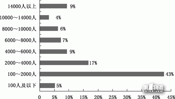 就业规模指园区管理机构人数与入驻企业中从事物流活动的就业人数之和。根据本次统计,2014年我国物流园区平均就业人数为5900人,具体分布如图22所示。